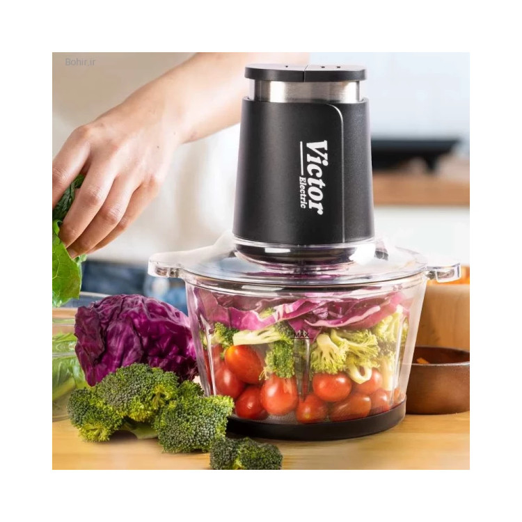 خردکن دوکاسه ویکتور مدل VK-1004CH اورجینال | خردکن پیرکس ۲ لیتری با موتور 900وات و تیغه نانو تیتانیوم